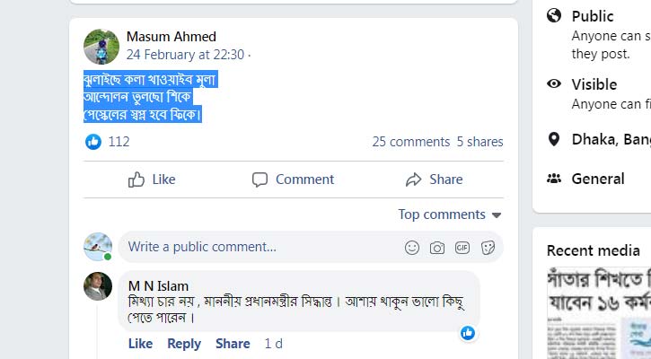 তার এই ছন্দের প্রতিউত্তরে একজন মন্তব্য করে লিখেছেন-মিথ্যা চার নয় , মাননীয় প্রধানমন্ত্রীর সিদ্ধান্ত । আশায় থাকুন ভালো কিছু পেতে পারেন ।