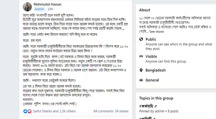 আমি: স্যার সরকারী চাকুরিজীবীদের নিয়ে সরকারের চিন্তাভাবনা কি ? বিশেষ করে ১১-২০ গ্রেড। নতুন কোন বেতন কাঠামো করার চিন্তা আছে কিনা ?