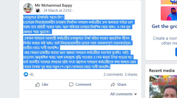 একজন সাধারন সরকারী কর্মচারীর দ্রব্যমূল্যের উর্ধ্ব গতির কারণে স্বাভাবিক জীবন নির্বাহ করতে কষ্ট হচ্ছে। তাই নিত্যপ্রয়োজনীয় দ্রব্যের সাথে সামঞ্জস্যপূর্ণ বেতনকাঠামো তৈরীর জোড় দাবী জানাচ্ছি।