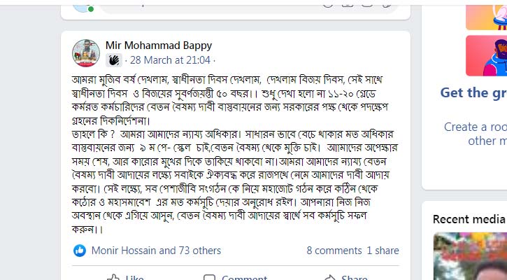 একজন লিখেছেন- আমরা মুজিব বর্ষ দেখলাম, স্বাধীনতা দিবস দেখলাম,  দেখলাম বিজয় দিবস, সেই সাথে স্বাধীনতা দিবস  ও বিজয়ের সুবর্ণজয়ন্তী ৫০ বছর।। শুধু দেখা হলো না ১১-২০ গ্রেডে  কর্মরত কর্মচারিদের বেতন বৈষম্য দাবী বাস্তবায়নের জন্য সরকারের পক্ষ থেকে পদক্ষেপ গ্রহনের দিকনির্দেশনা।