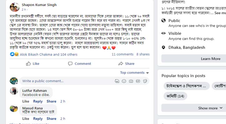 স্বপন কুমার সিং নামের একজন লিখেছেন- মাননীয় প্রধানমন্ত্রী সমীপে, সবই তো বাড়াতে ছারলেন না, আমাদের দিকে এবার তাকান। ১১ থেকে ২০ সবাই খুব অনাহারে আছেন। এদের আত্মক্রন্দন আপনি শুনতে পারেন কি? মনে হয় পারন না। পারলে এখনই ৯ম পে স্কেল এর ব্যবস্থা নিন। তাহলে এদের কাছ থেকে পাবেন দোয়া ভালবাসা নতুবা অভিষাপ। সবাই হতাস হয়ে আপনার দিকে চেয়ে আছেন। ১৫ সালে তেল ছিল ৫০-৬০ টাকা আর এখন ২০০+ আর কিছু নাই বল্লাম, উপর আমলারাদের এমনিই বেতন বেশি তারপর আবার এক্সট্রা ইনকাম তাদের না হলেও চলবে। তাদের অসুবিধা হচ্ছে শুনেছেন কি কখনো আমরা শুনেনি, শুনবেনও না। জুলাই ২৩ থেকে অন্তত ১-১০ ৩৫% এবং ১১ থেকে ২০ দের ৭৫% মহার্ঘ ভাতা চালু করেন।  নাহলে আল্লাহুতালা নারাজ হবেন। সামনে কঠিন সময় প্রকৃতি কাউকে ছারবেন না। একটু দয়া করেন। ভুল হলে ক্ষমা করবেন।
