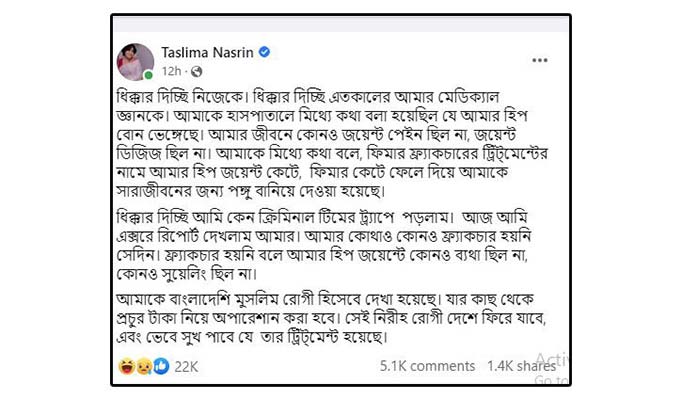 পোস্টে তিনি আরও বলেন, ‘ধিক্কার দিচ্ছি আমি কেন ক্রিমিনাল টিমের ট্র্যাপে পড়লাম। আজ আমি এক্সরে রিপোর্ট দেখলাম আমার। আমার কোথাও কোনও ফ্র্যাকচার হয়নি সেদিন। ফ্র্যাকচার হয়নি বলে আমার হিপ জয়েন্টে কোনও ব্যথা ছিল না, কোনও সুয়েলিং ছিল না। আমাকে বাংলাদেশি মুসলিম রোগী হিসেবে দেখা হয়েছে। যার কাছ থেকে প্রচুর টাকা নিয়ে অপারেশান করা হবে। সেই নিরীহ রোগী দেশে ফিরে যাবে, এবং ভেবে সুখ পাবে যে তার ট্রিটমেন্ট হয়েছে।’