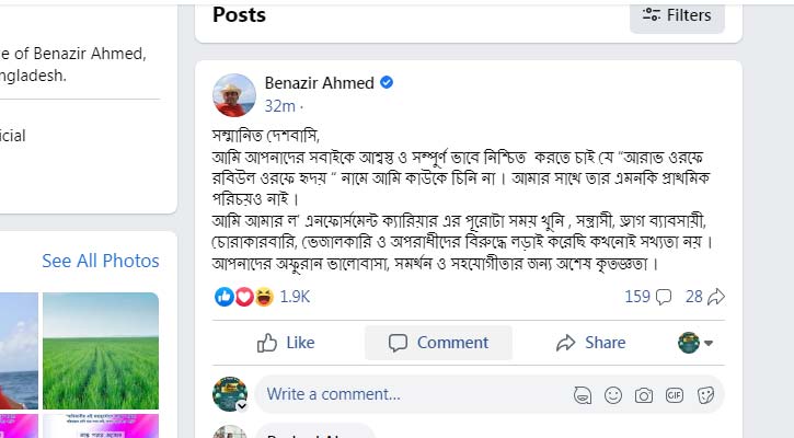 দেশবাসীর উদ্দেশ্যে বেনজির আহমেদ বলেন, আমি আপনাদের সবাইকে আশ্বস্ত ও সম্পূর্ণভাবে নিশ্চিত করতে চাই যে, আরাভ ওরফে রবিউল ওরফে হৃদয় নামে আমি কাউকে চিনি না। আমার সাথে তার এমনকি প্রাথমিক পরিচয়ও নাই।