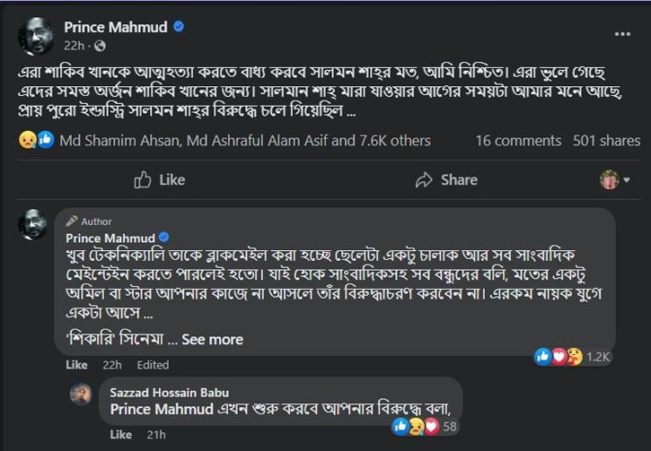 ফেসবুক স্ট্যাটাসে প্রিন্স মাহমুদ লিখেছেন, ‘এরা শাকিব খানকে আত্মহত্যা করতে বাধ্য করবে সালমান শাহ্র মত, আমি নিশ্চিত। এরা ভুলে গেছে এদের সমস্ত অর্জন শাকিব খানের জন্য। সালমান শাহ্ মারা যাওয়ার আগের সময়টা আমার মনে আছে। প্রায় পুরো ইন্ডাস্ট্রি সালমান শাহ্র বিরুদ্ধে চলে গিয়েছিল।’