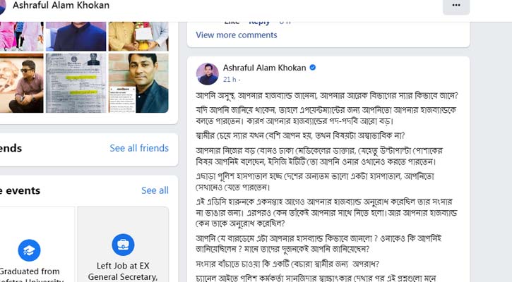 এছাড়া পুলিশ হাসপাতাল হচ্ছে দেশের অন্যতম ভালো একটা হাসপাতাল, আপনিতো সেখানেও যেতে পারতেন। এই এডিসি হারুনকে একসপ্তাহ আগেও আপনার হাজব্যান্ড অনুরোধ করেছিল তার সংসার না ভাঙার জন্য। এরপরও কেন তাঁকেই আপনার সাথে নিতে হলো।আর আপনার হাজব্যান্ড কেন তাকে অনুরোধ করেছিল?