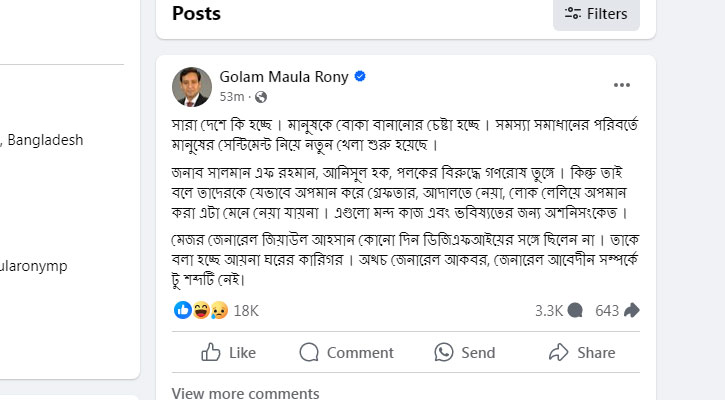 ঢাকা: দেশ-বিদেশের বিভিন্ন ইস্যু নিয়ে টকশো, ইউটিউব কিংবা ফেসবুক সর্বত্র সরব থাকেন সাবেক সংসদ সদস্য ও কলামিস্ট গোলাম মাওলা রনি। দেশের চলমান পরিস্থিতি নিয়েও তিনি নিয়মিত জাতিকে আপডেট রাখার চেষ্টা করছেন। এরই অংশ হিসেবে নিজের ভেরিফায়েড ফেসবুক অ্যাকাউন্ট থেকে দেশের বর্তমান পরিস্থিতি নিয়ে একটি স্ট্যাটাস দিয়েছেন তিনি।