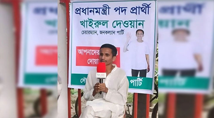 ব্যানারে লেখা রয়েছে- ‘প্রধানমন্ত্রী প্রার্থী খাইরুল দেওয়ান, চেয়ারম্যান, জনকল্যাণ পার্টি’। এতে তিনি জনগণের দোয়া ও সমর্থন কামনা করেছেন।