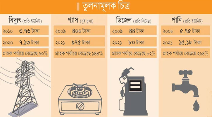 ঢাকা : পানি ছাড়া জীবন চলে না। গ্যাস, বিদ্যুৎ, জ্বালানিও সমান গুরুত্বপূর্ণ। কিন্তু খাল-বিল-নদীর দেশে দাম চড়ছে পানির। দফায় দফায় বাড়ছে অন্য তিনটি পণ্যের দামও। ধীরে ধীরে এসব যেন চলে যাচ্ছে সাধারণ মানুষের নাগালের বাইরে। অতি প্রয়োজনীয় পণ্যগুলোর দাম গত ১২ বছরে বেড়েছে দুই থেকে আড়াই গুণ। দুর্বিষহ জীবনে পড়েছেন শ্রমিক, কৃষক, চাকরিজীবী ও নিম্ন আয়ের মানুষ। বিনোদন, চিকিৎসা, লেখাপড়া এমনকি খাওয়ার খরচ কমিয়ে তারা চাপ সামলাচ্ছেন। সব দিকে কাটছাঁট করে শুধু প্রাণটুকু বাঁচিয়ে কাটিয়ে দিচ্ছেন দিন। নতুন করে দাম বাড়ানোর চেষ্টা যেন তাদের গলার ফাঁস হয়ে দাঁড়িয়েছে