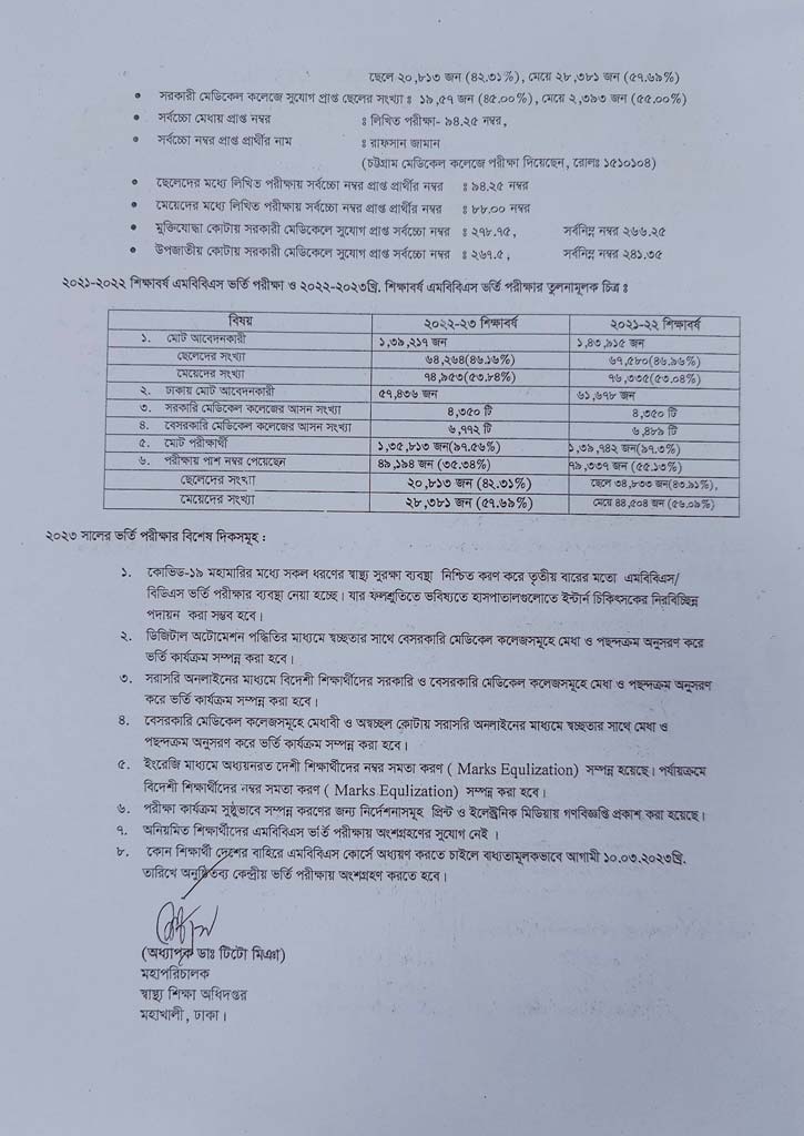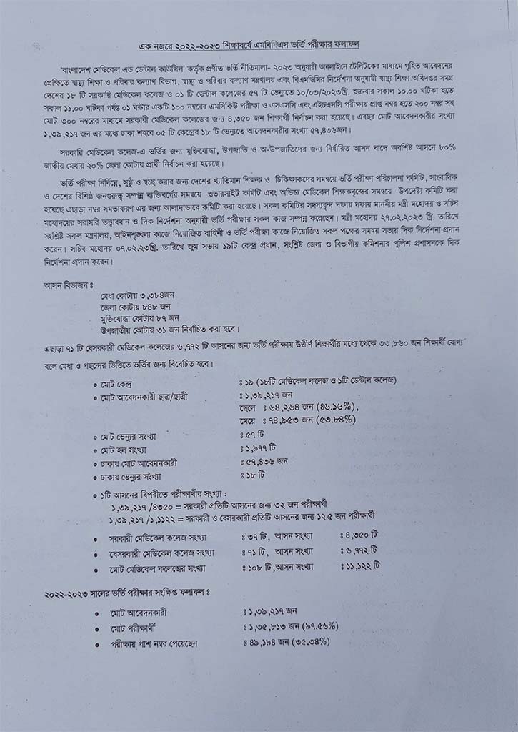 স্বাস্থ্য শিক্ষা অধিদপ্তরের মহাপরিচালক অধ্যাপক ডা. টিটো মিঞা স্বাক্ষরিত বিজ্ঞপ্তিতে জানানো হয়, ২০২২-২৩ শিক্ষাবর্ষে মেডিকেলের ভর্তি পরীক্ষায় অংশ নিতে আবেদন করেছিলেন ১ লাখ ৩৯ হাজার ২১৭ শিক্ষার্থী। তাদের মধ্যে পরীক্ষায় বসেন ১ লাখ ৩৫ হাজার ৮১৩ জন। পরীক্ষায় পাস করেন ৪৯ হাজার ১৯৪ জন, যা অংশগ্রহণকারীদের ৩৫ দশমিক ৩৪ শতাংশ।