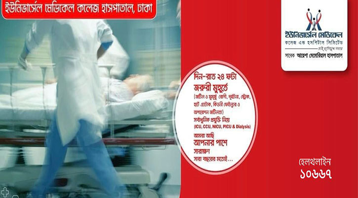 ঢাকা: আসন্ন ঈদুল আজহার ছুটিতে প্রতিবারের মতো এবারও রাজধানীর মহাখালীর ইউনিভার্সেল মেডিকেল কলেজ হাসপাতালের সব বিভাগ খোলা থাকবে। সড়ক দুর্ঘটনা, হেড ইনজুরি, হার্ট অ্যাটাক, হার্ট ফেইল্যুর, রেসপাইরেটরি ফেইল্যুর (তীব্র শ্বাসকষ্ট), অপারেশন-পরবর্তী জটিলতা, সিজার-পরবর্তী অতিরিক্ত রক্তক্ষরণজনিত জটিলতা।