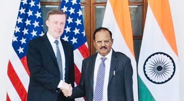 ভারতের জাতীয় নিরাপত্তা উপদেষ্টা (এনএসএ) অজিত দোভাল এবং যুক্তরাষ্ট্রের জাতীয় নিরাপত্তা উপদেষ্টা জ্যাক সুলিভান। ছবি: সংগৃহীত