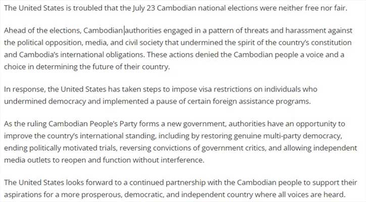 ওই বিজ্ঞপ্তিতে বলা হয়, কম্বোডিয়ার সাধারণ নির্বাচন অবাধ, সুষ্ঠু ও নিরপেক্ষ কোনোটাই হয়নি।