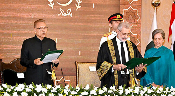 রোববার (১৭ সেপ্টেম্বর) রাজধানী ইসলামাবাদে আইওয়ান-ই-সদরে এক অনুষ্ঠানে নতুন প্রধান বিচারপতিকে শপথবাক্য পাঠ করান প্রেসিডেন্ট আরিফ আলভি।