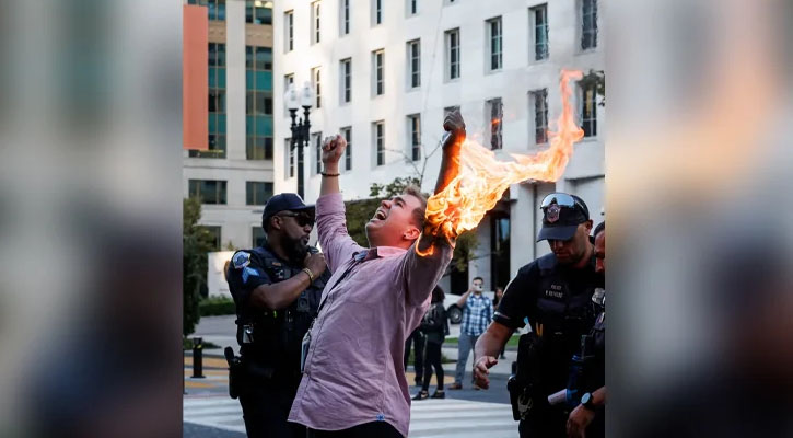 ঢাকা: গত বছরের ৭ অক্টোবরের পর থেকে গাজায় ইসরায়েলের নির্বিচারে হামলার প্রতিবাদে দেশে দেশে চলছে বিক্ষোভ। শনিবার (৫ অক্টোবর) রাতে যুক্তরাষ্ট্রের রাজধানী ওয়াশিংটন ডিসিতে এমনই এক বিক্ষোভ চলাকালে নিজের গায়ে আগুন দিয়েছেন ফিলিস্তিনপন্থী এক ব্যক্তি। এ ঘটনার একাধিক ছবি প্রকাশ করেছে বার্তা সংস্থা রয়টার্স ও ওয়াশিংটন পোস্ট। খবর ওয়াশিংটন পোস্ট
