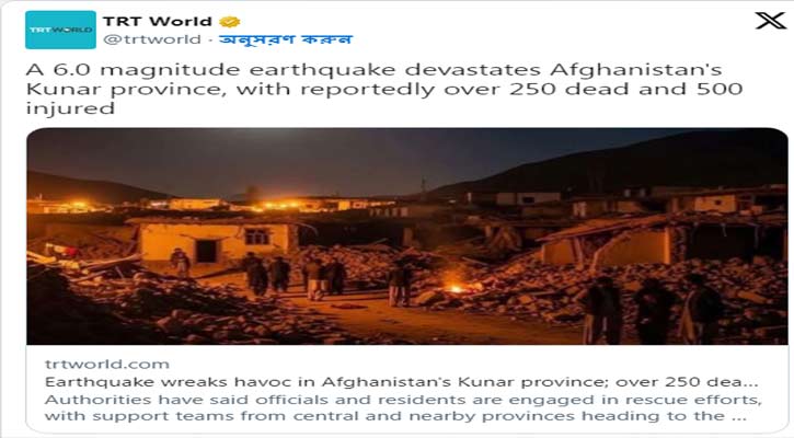 সংবাদমাধ্যমটি বলছে, আফগানিস্তানের পূর্বাঞ্চলে রোববার গভীর রাতে শক্তিশালী ভূমিকম্প আঘাত হেনেছে। এতে ব্যাপক প্রাণহানির ঘটনা ঘটেছে বলে স্থানীয় কর্মকর্তারা জানিয়েছেন। সবচেয়ে ক্ষতিগ্রস্ত হয়েছে কুনার প্রদেশ। আফগান তথ্য মন্ত্রণালয় তুর্কি সংবাদ সংস্থা আনাদোলুকে জানিয়েছে, সেখানে অন্তত ২৫০ জন নিহত এবং ৫০০ জন আহত হয়েছেন।
