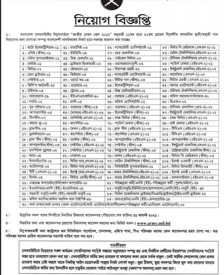 ঢাকা: জনবল নিয়োগের বিজ্ঞপ্তি দিয়েছে বাংলাদেশ সেনাবাহিনী। প্রতিষ্ঠানটি শতাধিক পদে মোট ৬২৮ জনকে নিয়োগ দেবে। আগ্রহীরা অনলাইনেই আবেদন করতে পারবেন। আবেদনের শেষ তারিখ ৩১ আগস্ট, ২০২১।