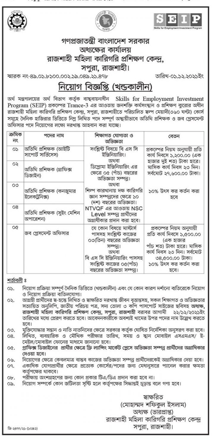 পদের নাম: অতিথি প্রশিক্ষক (আইটি সাপোর্ট সার্ভিসেস, গ্রাফিকস ডিজাইন, কনজ্যুমার ইলেকট্রনিকস ও সুইং মেশিন অপারেশন)