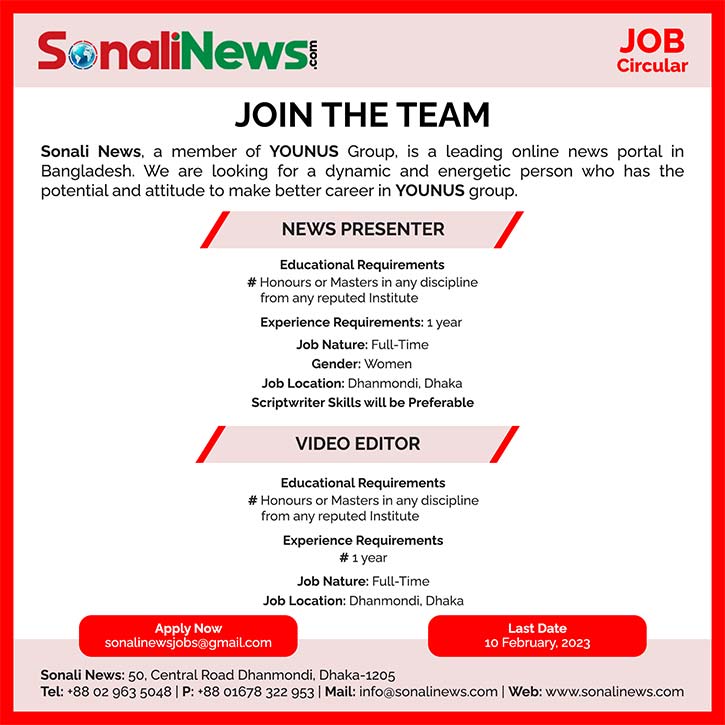 ঢাকা: বিভিন্ন পদে জনবল নিয়োগ দিচ্ছে সরকার নিবন্ধিত দেশের শীর্ষস্থানীয় অনলাইন নিউজ পোর্টাল সোনালীনিউজডটকম। প্রতিষ্ঠানটির ২ পদে নিয়োগ পেতে আগ্রহীরা ই-মেইলের ([email protected]) মাধ্যমে আবেদন করতে পারবেন।