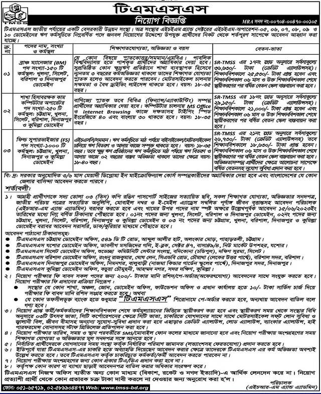 ঢাকা: সম্প্রতি নিয়োগ বিজ্ঞপ্তি দিয়েছে বেসরকারি উন্নয়ন সংস্থা ঠেঙ্গামারা মহিলা সবুজ সংঘ (টিএমএসএস)। প্রতিষ্ঠানটি তাদের এইচইএম গ্র্যান্ড সেক্টরের ঋণ কর্মসূচিতে ১ হাজার ৪০০ কর্মী নিয়োগ দেবে। আগ্রহীরা ডাকযোগে আবেদনপত্র পাঠাতে পারবেন।