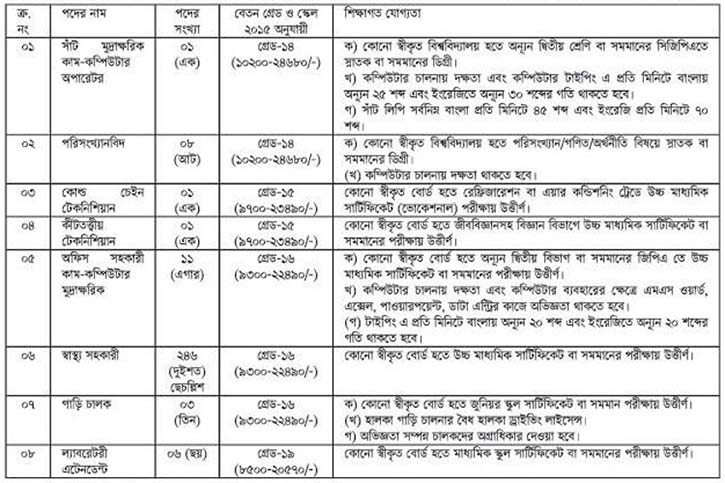 আবেদন ফি: টেলিটক প্রি-পেইডের মাধ্যমে ১-৭ নং পদের জন্য ২২৩ টাকা, ৮ নং পদের জন্য ১১২ অফেরতযোগ্য হিসেবে ৭২ ঘণ্টার মধ্যে পাঠাতে হবে।