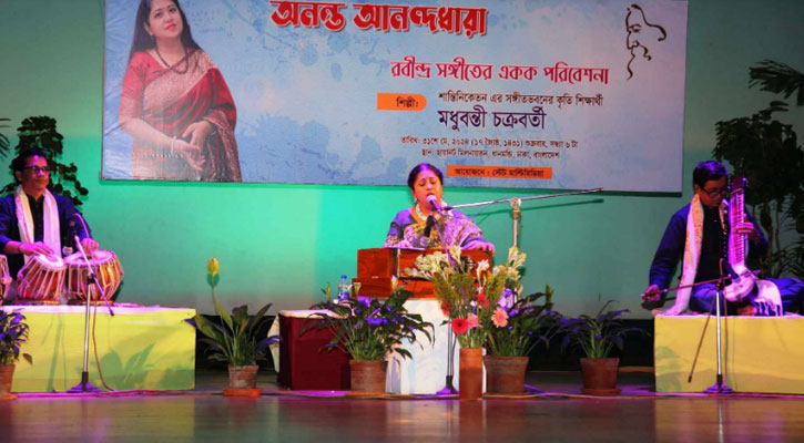 ঢাকা: আলো ঝলমল ছায়ানট মিলনায়তন। মঞ্চে শিল্পী মধুবন্তী চক্রবর্তী, সাথে সঙ্গীয় বাদ্যিযন্ত্রী। সূচনাতে শিল্পী মায়াবী কণ্ঠে সুধালেন ‘তাই তোমার আনন্দ আমার পর’; শুক্রবার (৩১ মে) সন্ধ্যায় তার গানের মুগ্ধতায় আবির ছড়িয়েছে দর্শক পরিপূর্ণ ছায়ানট অডিটরিয়ামে।