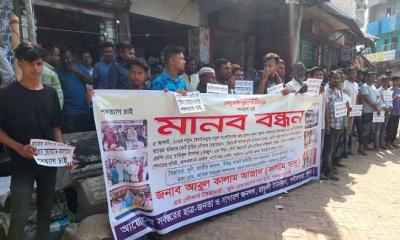 শান্তিপূর্ণ মানব বন্ধনে ছাত্র সমাজ ও সাধারণ জনতার দাবি খুনি নৌকার চেয়ারম্যান কালামের পদত্যাগ চাই, খুনি কালামের ছোট পুত্র এসপির স্থায়ী বরখাস্ত চাই, গৃহকর্মী খুনের বিচার চাই, এবং বিএনপি নামধারী নেতা মো. রফিকুল ইসলাম (পাগলা রফিক) এর বিএনপি থেকে আজীবনের জন্য বহিষ্কার চাই।