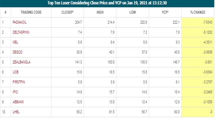 দর পতনের তালিকায় চতুর্থ স্থানে থাকা ডেসকো লিমিটেড এর ৩ দশমিক ৯৫ শতাংশ, পঞ্চম স্থানে থাকা জিলবাংলা লিমিটেড এর ৩ দশমিক ৬৮ শতাংশ, ষষ্ঠ স্থানে থাকা ইউনাইটেড কমার্শিয়াল ব্যাংক এর ৩ দশমিক ৬৩ শতাংশ, সপ্তম স্থানে থাকা ফার্স্ট ফিন্যান্স এর ৩ দশমিক ২৭ শতাংশ, অষ্টম স্থানে থাকা আইএফআইসি ব্যাংক এর ৩ দশমিক ২৪ শতাংশ, নবম স্থানে থাকা এবি ব্যাংক এর ৩ দশমিক ১০ শতাংশ এবং দশম স্থানে থাকা লাফার্জহোলসিম লিমিটেড এর শেয়ার দর ৩ শতাংশ দর কমেছে।
