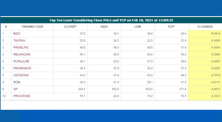 পতনের তালিকায় চতুর্থ স্থানে থাকা রিলায়েন্স ইন্স্যুরেন্স লিমিটেডের দর কমেছে ২ দশমিক ৫৮ শতাংশ, পঞ্চম স্থানে থাকা রূপালি লাইফ ইন্স্যুরেন্স কোম্পানি লিটেডের ৩ দশমিক ৩৬ শতাংশ, ষষ্ঠ স্থানে থাকা প্রাইম ইন্স্যুরেন্স কোম্পানি লিমিটেডের ৪ দশমিক ৮৪ শতাংশ, সপ্তম স্থানে থাকা উনাইটেড ইন্স্যুরেন্স লিমিটেডের ৬ দশমিক ৭১ শতাংশ, অষ্টম স্থানে থাকা রবি আজিয়াটা লিমিটেডর ৪ দশমিক ৬১ শতাংশ, নবম স্থানে থাকা গ্রামীনফোন লিমিটেডের ৪ দশমিক ৬৬ শতাংশ এবং দশম স্থানে থাকা প্রভাতী ইন্স্যুরেন্স কোম্পানি লিমিটেডের শেয়ার দর ৪ দশমিক ৫৯ শতাংশ দর কমেছে।