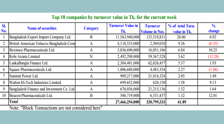 জানা যায়, সপ্তাহজুড়ে কোম্পানিটির ১২ কোটি ৫৫ লাখ ১৮ হাজার ৮৩১টি শেয়ার লেনদেন হয়েছে। যার বাজার মূল্য ১ হাজার ১৫৬ কোটি ৩৯ লাখ ৪০ হাজার টাকা।