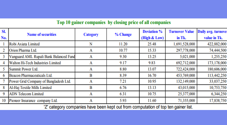 তালিকার কোম্পানিগুলো মধ্যে চতুর্থ স্থানে থাকা ওয়ালটন হাই-টেক ইন্ডাস্ট্রিজ লিমিটেডের ৯ দশমিক ১৭ শতাংশ, পঞ্চম স্থানে থাকা সামিট পাওয়ার লিমিটেডের ৮ দশমিক ৮০ শতাংশ, ষষ্ঠ স্থানে থাকা বীকন ফার্মাসিউটিক্যালস লিমিটেড ৮ দশমিক ৩৯ শতাংশ, সপ্তম স্থানে থাকা পাওয়ার গ্রিড কোম্পানি অব বাংলাদেশ লিমিটেডের ৭ দশমিক ২১ শতাংশ, অষ্টম স্থানে থাকা আলহাজ্ব টেক্সটাইল মিলস লিমিটেডের ৬ দশমিক ৭৬ শতাংশ, নবম স্থানে থাকা এডিএন টেলিকম লিমিটেডের ৬ দশমিক ৩১ শতাংশ এবং দশম স্থানে থাকা পাইওনিয়ার ইন্স্যুরেন্স কোম্পানি লিমিটেডের ৫ দশমিক ৯৩ শতাংশ দর বেড়েছে সপ্তাহজুড়ে।
