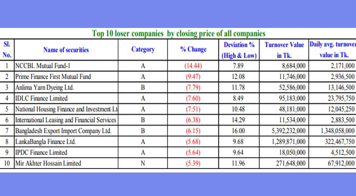 দর কমার শীর্ষে অন্যান্য কোম্পানিগুলোর মধ্যে চতুর্থ অবস্থানে থাকা আইডিএলসি ফাইন্যান্সের ৭ দশমিক ৬০ শতাংশ, পঞ্চম স্থানে থাকা ন্যাশনাল হাউজিংয়ের ৭ দশমিক ৫১ শতাংশ, ষষ্ঠ স্থানে থাকা ইন্টারন্যাশনাল লিজিংয়ের ৬ দশমিক ৩৮ শতাংশ, সপ্তম স্থানে থাকা বেক্সিমকোর ৬ দশমিক ১৫ শতাংশ, অষ্টম স্থানে থাকা লংকাবাংলা ফাইন্যান্সের ৫ দশমিক ৬৮ শতাংশ, নবম স্থানে থাকা আইপিডিসি ফাইন্যান্সের ৫ দশমিক ৬৪ শতাংশ, এবং দশম স্থানে থাকা মীর আখতার হেসাইনের শেয়ার দর সপ্তাহজুড়ে কমেছে ৫ দশমিক ৩৯ শতাংশ।