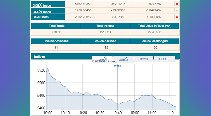 ডিএসই সূত্রে জানা গেছে, ডিএসই’র ব্রড ইনডেক্স এসময় ৫৩ পয়েন্ট কমে দাঁড়িয়েছে ৫ হাজার ৫৫৩ পয়েন্টে। আর ডিএসই শরিয়াহ সূচক ১০ পয়েন্ট কমে হয়েছে ১ হাজার ২৬৭ পয়েন্ট এবং ডিএসই-৩০ সূচক ২৯ পয়েন্ট কমে দাঁড়ায় ২১৩৩ পয়েন্টে।