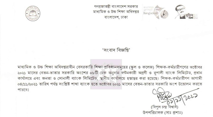 ঢাকা : বেসরকারি স্কুল ও কলেজের শিক্ষক-কর্মচারীদের অক্টোবর (২০২১) মাসের এমপিওর চেক ছাড় হয়েছে।
