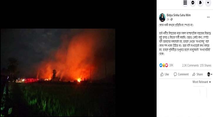 নিজের ভেরিফায়েড ফেসবুক পেজে এই নায়িকা লেখেন, “কোনো ধর্মই কখনো প্রতিহিংসা শেখায় না। তাই ধর্মীয় বিশ্বাসের নামে সকল সাম্প্রদায়িক সন্ত্রাসের বিরুদ্ধে সুষ্ঠু তদন্ত ও বিচার দাবি করছি। আরও একটা কথা, দেশটা যদি আমাদের সকলেরই হয়, তাহলে এখানে ‘সংখ্যালঘু’ বলে কোন শব্দ থাকা উচিত না। আর যদি সংখ্যাতেই কথা বলতে হয়, তাহলে পৃথিবীতে শুধুমাত্র ভালো মানুষেরাই ‘সংখ্যাগরিষ্ঠ’ হোক।”