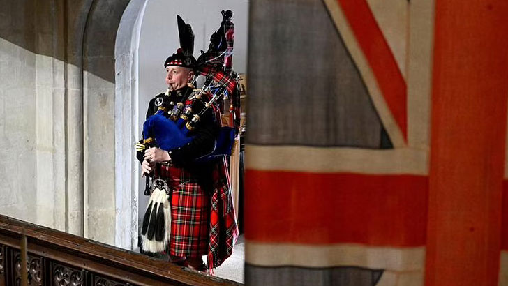 সেন্ট জর্জ চ্যাপেল সমাধিতে রানীর কফিন নামানোর সময় শেষবারের মতো রানির সম্মানে ব্যাগপাইপার বাজান পাইপার।