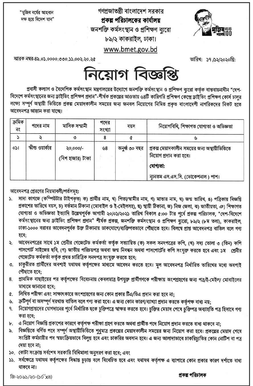 আবেদনের ঠিকানা: প্রকল্প পরিচালক, দেশে-বিদেশে কর্মসংস্থানের জন্য ড্রাইভিং প্রশিক্ষণ প্রদান শীর্ষক প্রকল্প, জনশক্তি কর্মসংস্থান ও প্রশিক্ষণ ব্যুরো, ৮৯/২ (৮ম তলা), কাকরাইল, ঢাকা-১০০০।