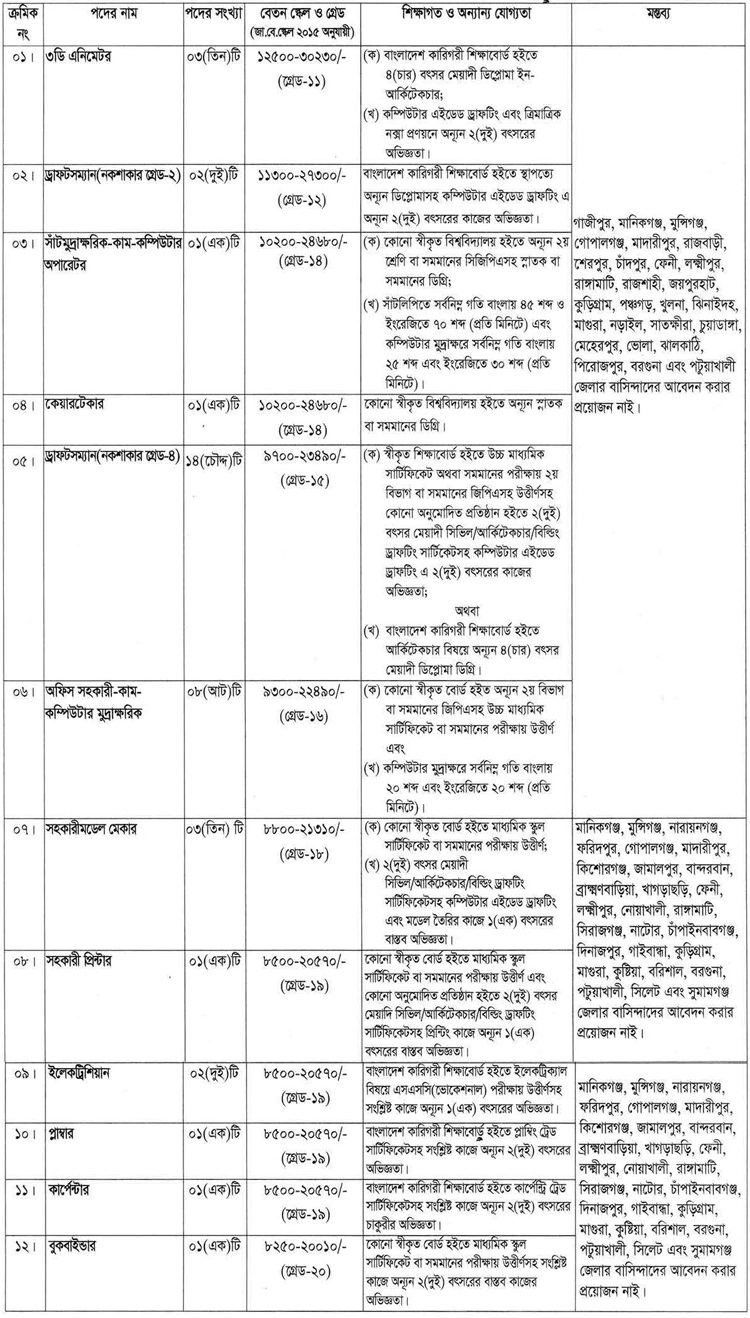 আবেদন ফি: পোস্টাল অর্ডার/ব্যাংক ড্রাফট/পে-অর্ডারের মাধ্যমে ১-৬ নং পদের জন্য ১০০ টাকা, ৭-১২ নং পদের জন্য ৫০ টাকা পাঠাতে হবে।