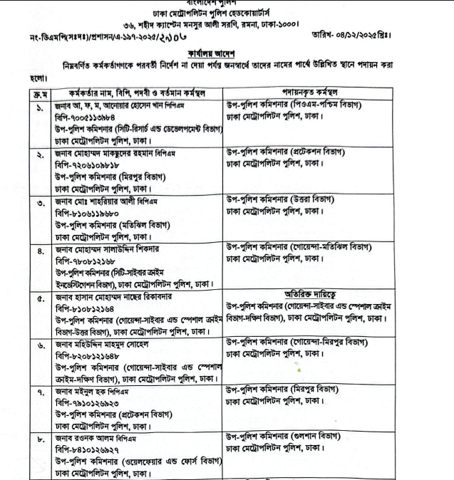 বৃহস্পতিবার (৪ ডিসেম্বর) ডিএমপি কমিশনার শেখ মো. সাজ্জাত আলী স্বাক্ষরিত এক আদেশে এ বদলি করা হয়েছে।