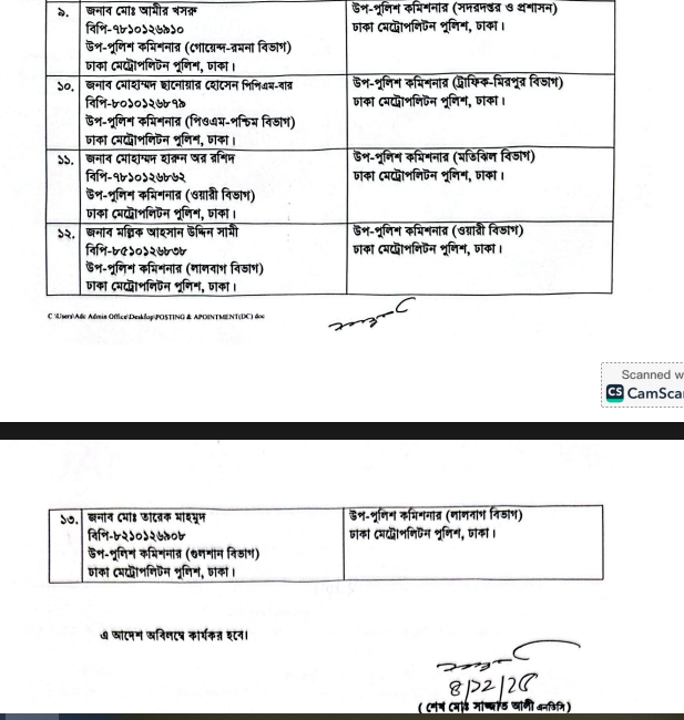 অন্যদিকে বৃহস্পতিবার ডিএমপি কমিশনার শেখ মো. সাজ্জাত আলী স্বাক্ষরিত অপর একটি আদেশে ডিএমপির উত্তরা বিভাগের ডিসি (সুপারনিউমারির অতিরিক্ত ডিআইজি) মো. মহিদুল ইসলামকে ডিএমপির ক্রাইম প্রিভেনশন বিভাগের যুগ্ম কমিশনার (ভারপ্রাপ্ত) হিসেবে বদলি করা হয়েছে।