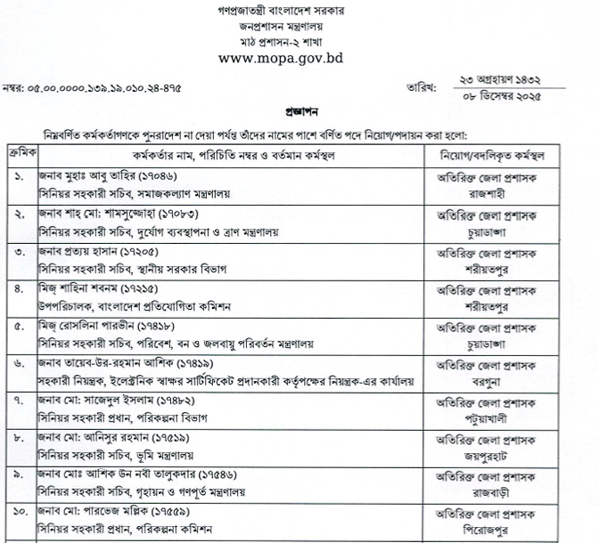 নিয়োগ পাওয়া কর্মকর্তারা আগামী ১১ ডিসেম্বরের মধ্যে বদলি করা কর্মস্থলে যোগদান করবেন, অন্যথায় আগামী ১১ ডিসেম্বর বিকেলে বর্তমান কর্মস্থল (প্রশিক্ষণ/কর্মস্থল) থেকে তাৎক্ষণিক অবমুক্ত (স্ট্যান্ড রিলিজ) বলে গণ্য হবেন।