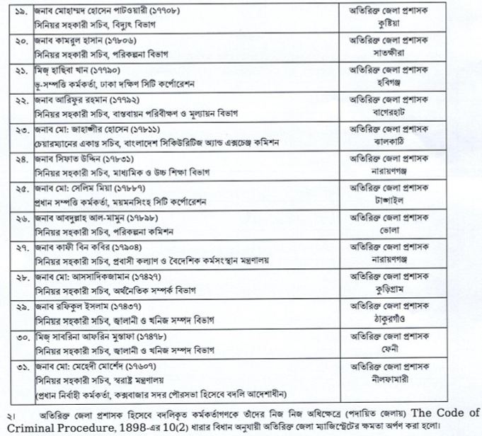 প্রজ্ঞাপনে বলা হয়, অতিরিক্ত জেলা প্রশাসক হিসেবে বদলি করা কর্মকর্তাদের তাদের নিজ অধিক্ষেত্রে এক্সিকিউটিভ ম্যাজিস্ট্রেট হিসেবে দায়িত্ব পালনের জন্য ‘দ্য কোড অব ক্রিমিন্যাল প্রসিডিউর, ১৮৯৮’ এর ১০(২) ধারার বিধান অনুযায়ী অতিরিক্ত জেলা ম্যাজিস্ট্রেটের ক্ষমতা অর্পণ করা হলো।