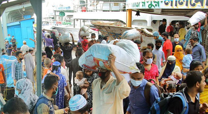 ঈদকে ঘিরে কঠোর বিধিনিষেধ শিথিলের সুযোগে ঢাকা ছাড়ছেন ঢাকার অনেকে। প্রতিটি ফেরিঘাটে মানুষের ঢল নেমেছে। প্রতিটি লঞ্চে গাদাগাদি করে মানুষ যাচ্ছেন। শিমুলিয়া-কাওড়াকান্দি নৌরুটে ৮০টি লঞ্চ ও ১৩টি ফেরি চলাচল করছে, কিন্তু যানবাহন ও মানুষের চাপে কুলিয়ে উঠতে পারছে না সেগুলো। একই অবস্থা বাসস্টেশনগুলোতেও। সবখানেই স্বাস্থ্যবিধি উধাও।