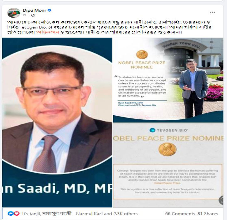 সামাজিক যোগাযোগমাধ্যম ফেসবুকে এক পোস্টে ডা. দীপু মনি লিখেছেন, আমাদের ঢাকা মেডিকেল কলেজের কে-৪০ ব্যাচের বন্ধু রায়ান সাদী এমডি, এমপিএইচ, চেয়ারম্যান ও সিইও Tevogen Bio, এ বছরের নোবেল পুরস্কারের জন্য মনোনীত হয়েছেন। আমরা গর্বিত। সাদীর প্রতি প্রাণঢালা অভিনন্দন ও শুভেচ্ছা। সাদী ও তার পরিবারের প্রতি নিরন্তর শুভকামনা।