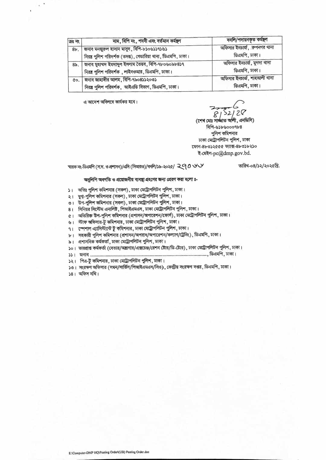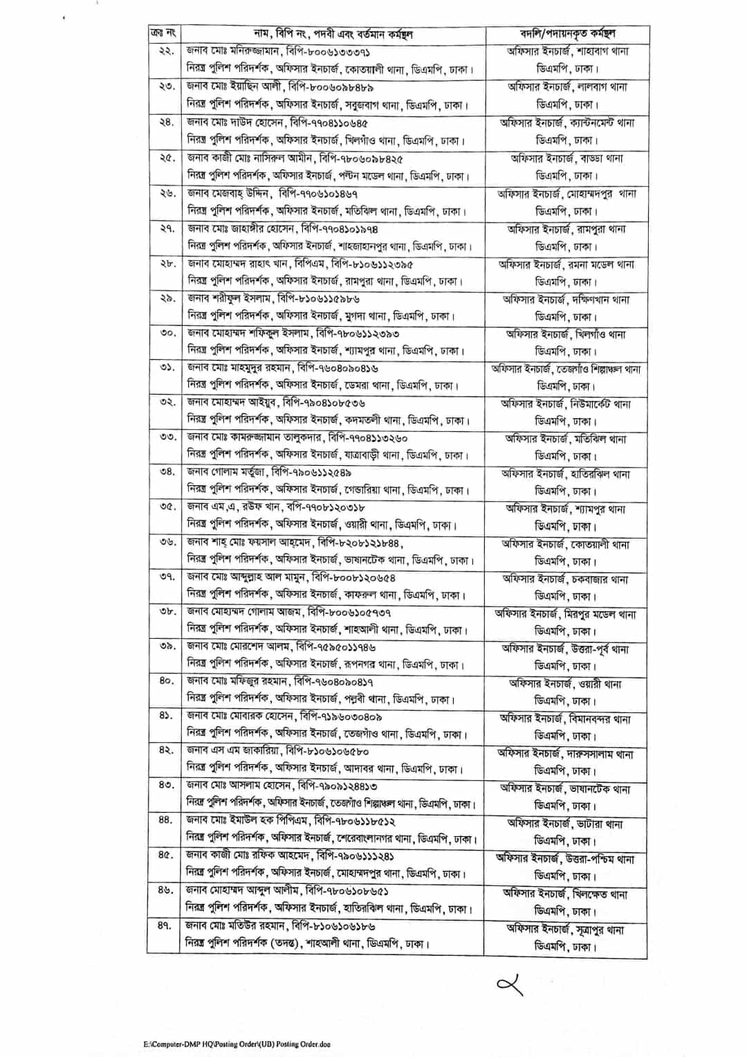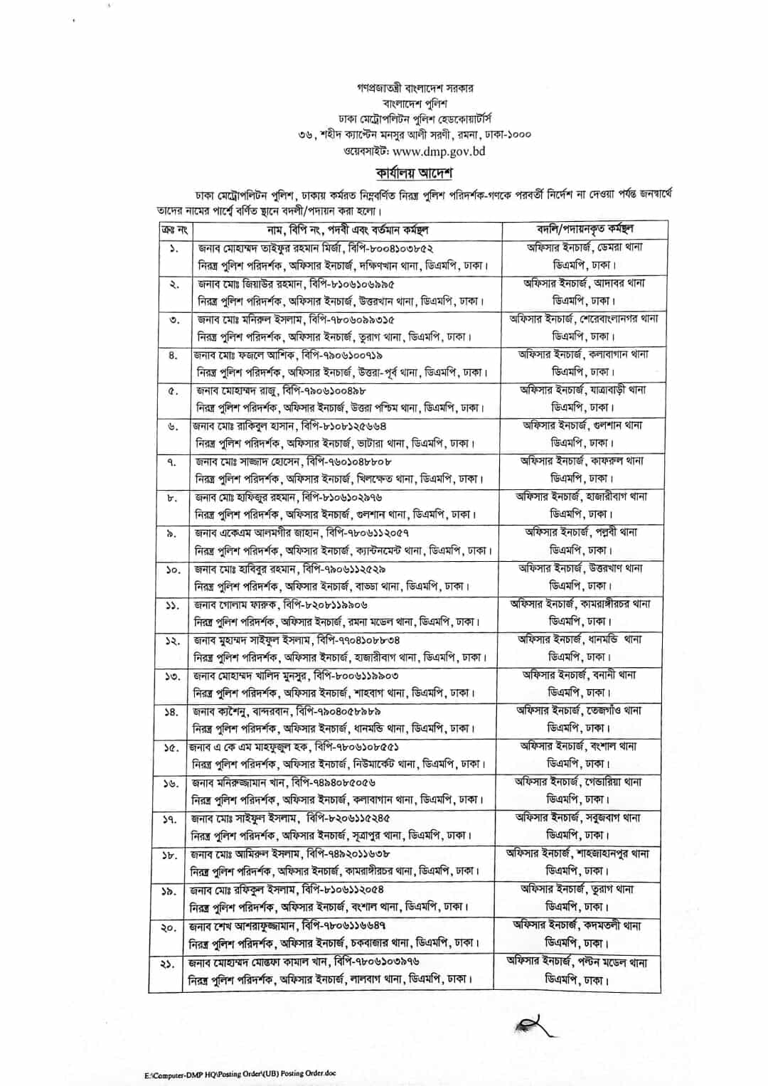 আদেশ বলা হয়, ঢাকা মেট্রোপলিটন পুলিশ, ঢাকায় কর্মরত নিম্নবর্ণিত নিরস্ত্র পুলিশ পরিদর্শক-গণকে পরবর্তী নির্দেশ না দেওয়া পর্যন্ত জনস্বার্থে তাদের নামের পার্শ্বে বর্ণিত স্থানে বদলী/ পদায়ন করা হলো।