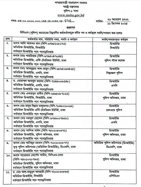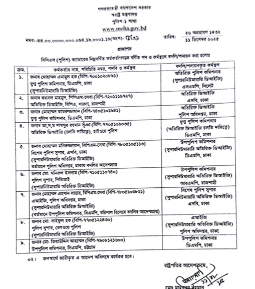 শুক্রবার (১২ ডিসেম্বর) স্বরাষ্ট্র মন্ত্রণালয় এ বদলির তথ্য জানিয়েছে। মন্ত্রণালয়ের পুলিশ-১ শাখার উপসচিব মো. মাহবুবুর রহমানের সই করা পৃথক দুটি প্রজ্ঞাপনে এ বদলির করা হয়।