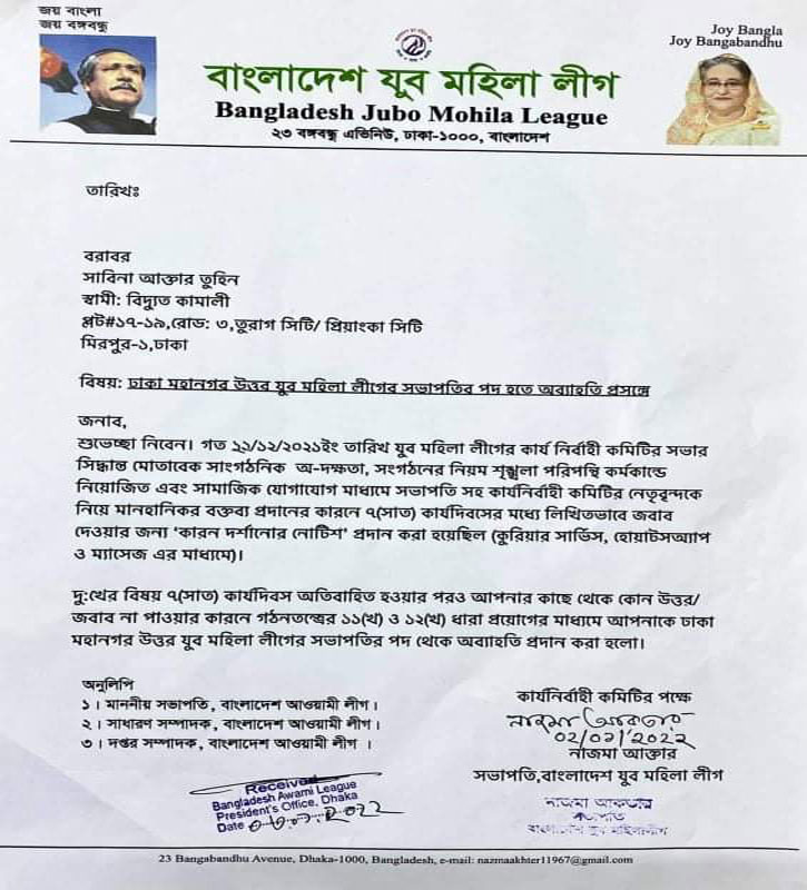 সাত কার্যদিবস অতিবাহিত হওয়ার পরও কোনো উত্তর না পাওয়ায় আপনাকে গঠনতন্ত্রের ১১(খ) ও ১২(খ) ধারায় ঢাকা মহানগর উত্তর যুব মহিলা লীগের সভাপতির পদ থেকে অব্যাহতি প্রদান করা হলো।