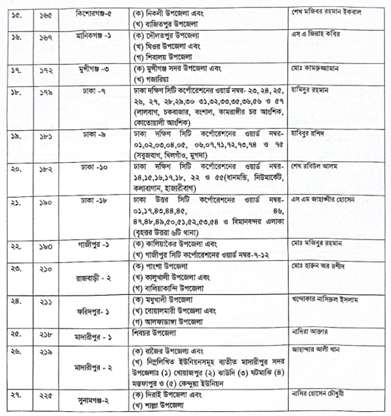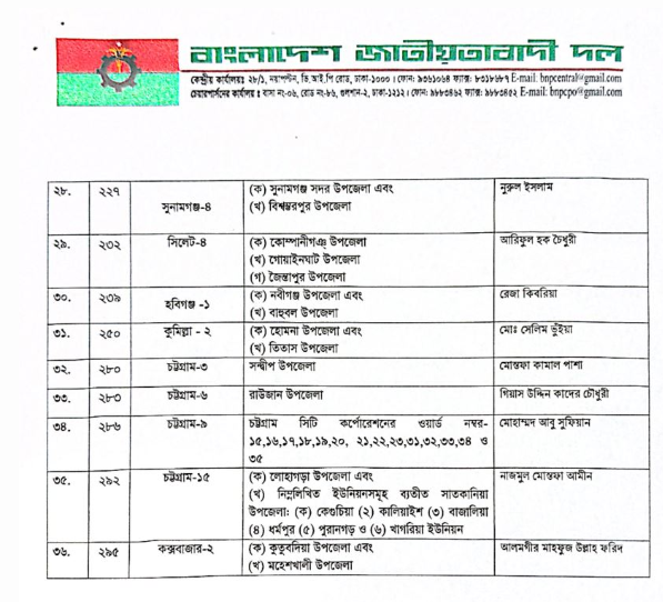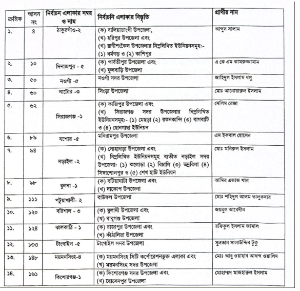 আরও যারা মনোনয়ন পেয়েছেন তারা হলেন-ঢাকা-৭ আসনে হামিদুর রহমান, ঢাকা-৯ আসনে হাবিবুর রশিদ, ঢাকা-১০ আসনে শেখ রবিউল আলম, ঢাকা-১৮ আসনে েএস এম জাহাঙ্গীর হোসেন, গাজীপুর-১ আসনে মোঃ মজিবুর রহমান, রাজবাড়ী-২ আসনে মোঃ হারুন অর রশীদ, ফরিদপুর-১ আসনে খন্দোকার নাসিরুল ইসলাম, মাদারীপুর-১ আসনে নাদিরা আক্তার, মাদারীপুর-২ আসনে জাহান্দার আলী খান, সুনামগঞ্জ-২ আসনে নাসির হোসেন চৌধুরী, সুনামগঞ্জ-৪ আসনে নুরুল ইসলাম, সিলেট-৪ আসনে আরিফুল হক চৌধুরী, হবিগঞ্জ-১ আসনে রেজা কিবরিয়া, কুমিল্লা-২ আসনে মোঃ সেলিম ভুঁইয়া, চট্টগ্রাম-৩ আসনে মোস্তফা কামাল পাশা, চট্টগ্রাম-৬ আসনে গিয়াস উদ্দিন কাদের চৌধুরী, চট্টগ্রাম-৯ আসনে মোহাম্মদ আবু সুফিয়ান, চট্টগ্রাম-১৫ আসনে নাজমুল মোস্তফা আমীন এবং কক্সবাজার-২ আসনে আলমগীর মাহফুজ উল্লাহ ফরিদ।