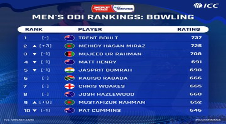 মিরাজের উত্থানে এক ধাপ করে অবনমন ঘটেছে মুজিব উর রহমান, ম্যাট হেনরি ও জাসপ্রিত বুমরাহর, যারা যথাক্রমে তৃতীয়, চতুর্থ ও পঞ্চম স্থানে অবস্থান করছেন। ষষ্ঠ, সপ্তম ও অষ্টম স্থানে থাকা কাগিসো রাবাদা, ক্রিস ওকস ও জশ হ্যাজলউডের অবস্থানের কোনো পরিবর্তন হয়নি।
