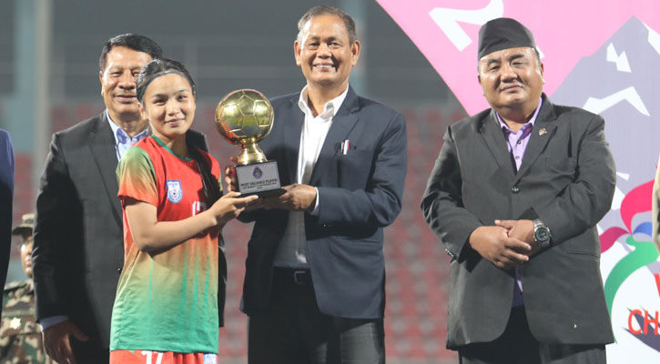 সেরার সেরা ঋতুপর্ণা চাকমা : বাংলাদেশের সাফের শিরোপা ধরে রাখার পেছনে গুরুত্বপূর্ণ অবদান রেখেছেন মিডফিল্ডার ঋতুপর্ণা চাকমা। ফাইনালের ম্যাচসেরা খেলোয়াড়ের পুরস্কার উঠেছে তার হাতে। এমনকি টুর্নামেন্টের সেরা খেলোয়াড়ের পুরস্কারও পেলেন তিনি। টুর্নামেন্ট জুড়েই দুর্দান্ত পারফর্ম করেছেন এই নারী ফুটবলার। ফাইনালে নেপালের বিপক্ষে তার গোলেই চ্যাম্পিয়ন হয়েছে বাংলাদেশ।
