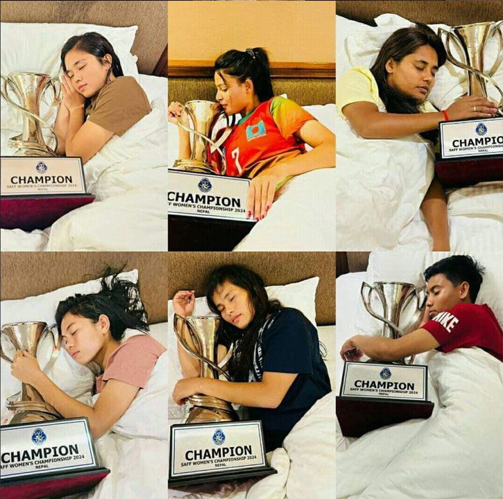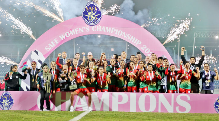 ২০২২ সালের অক্টোবরে নেপালকে তাদের মাঠেই ৩-১ গোলে হারিয়ে প্রথমবারের মতো নারী সাফের শিরোপা জিতেছিলেন সাবিনা খাতুনরা। এবারের আসরেও হিমালয় কন্যাদের হারিয়ে শিরোপা উৎসবে মেতেছেন তারা।